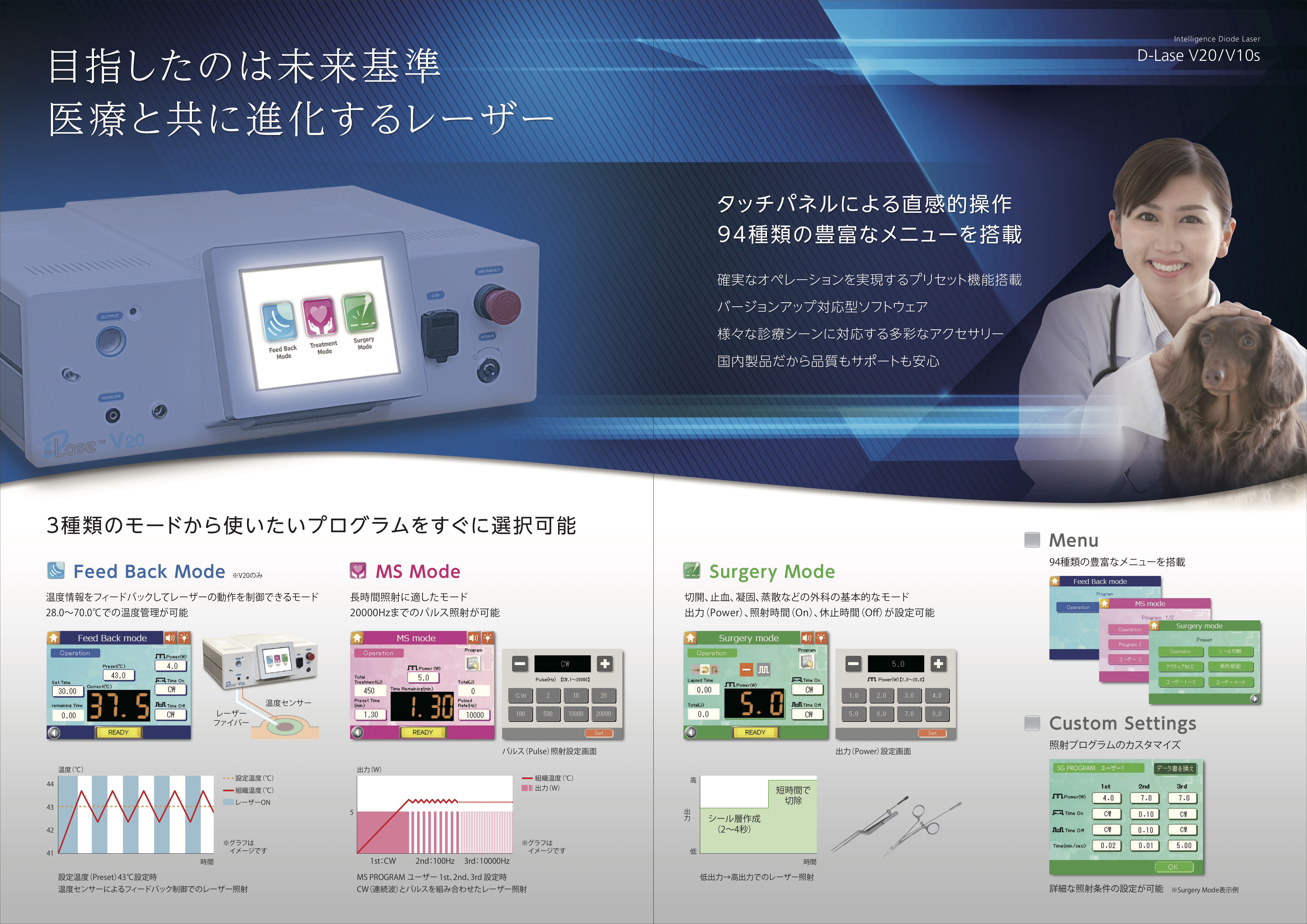 参考までに、当院の半導体レーザー・飛鳥メディカル D-Lase V20 のカタログとパンフレットを抜粋して下記に掲載しました。